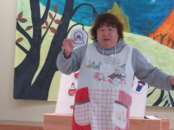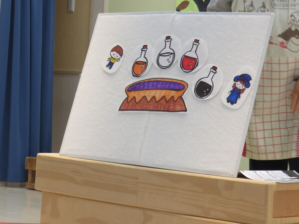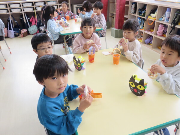 自分で製作したお菓子バッグを持って、遊戯室に集まり、ハロウィンの手遊びやパネルシアターを見て楽しみました。