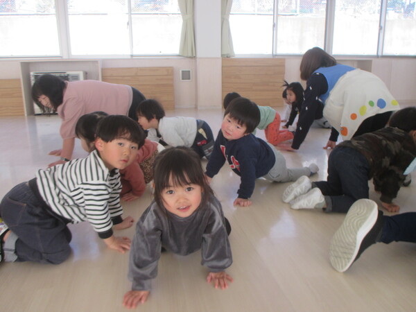 先生と一緒に歩いたり、ハイハイをして、体も動かしながら楽しみました。